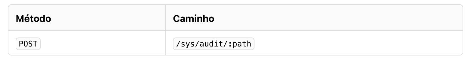 O /sys/audit terminal é usado para listar, habilitar e desabilitar dispositivos de auditoria. Os dispositivos de auditoria devem ser ativados antes do uso e mais de um dispositivo pode ser ativado por vez.