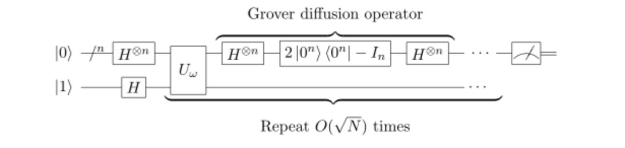 O Algoritmo de Grover (ou simplesmente de Grover) explora o paralelismo quântico para pesquisar rapidamente o valor de entrada estatisticamente provável de uma operação de caixa preta. O de Grover não produz ataques que invalidam campos inteiros de criptografia como o de Shor. Mas reduz a dificuldade de procurar de forma inteligente as chaves da criptografia de chave simétrica por meio da pesquisa de força bruta. Essa entropia é extremamente valiosa em criptografia, pois operações como geração de chave para criptografia de chave simétrica como AES ou geração de chaves de sessão efêmeras para SSH/TLS exigem fontes robustas de entropia para geração de números aleatórios.[b]