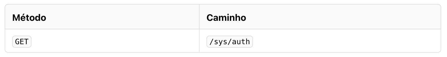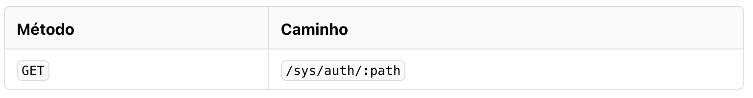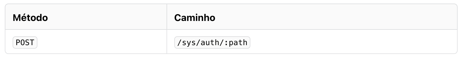 O /sys/auth endpoint é usado para listar, criar, atualizar e excluir métodos de autenticação. Os métodos de autenticação convertem as informações fornecidas pelo usuário ou pela máquina em um token que pode ser usado para todas as solicitações futuras.