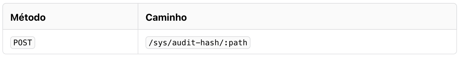 O /sys/audit-hash endpoint é usado para calcular o hash dos dados usados pela função hash e salt de um dispositivo de auditoria. Isso pode ser usado para pesquisar logs de auditoria para um valor de hash quando o valor original é conhecido.